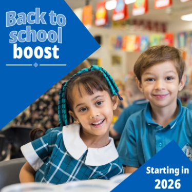 The Back to school boost provides a $100 credit for each primary school student (Prep to Year 6) to help with school-related costs. Your family can use the credit for costs such as Student Resource Scheme fees, excursions, camps, or extra-curricular activities. The credit will be automatically added to each students' accounts at the start of the year and can be used throughout the year. The credit cannot be used to reimburse purchases from external suppliers or as a cash payment. We will ask you how you would like to apply your Back to school boost before we apply it to a charge.